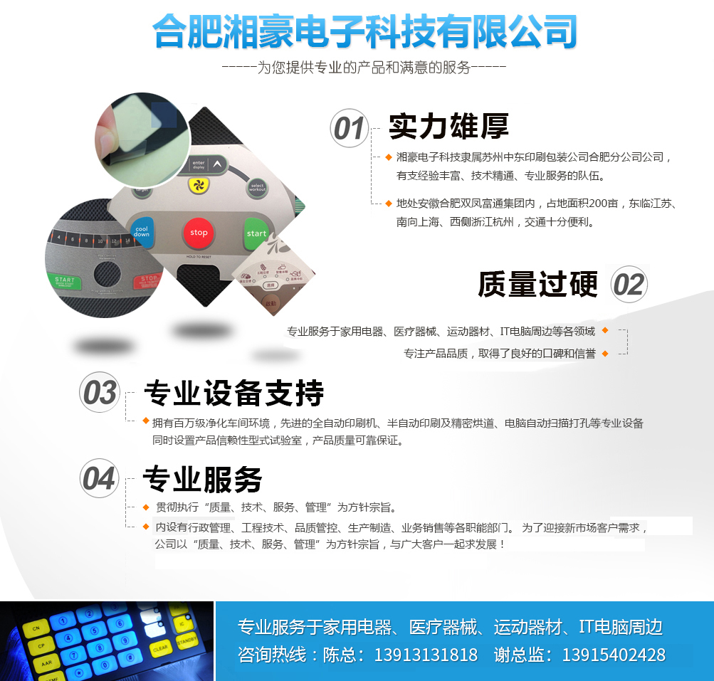 公司簡(jiǎn)介 合肥湘豪電子科技有限公司系香港中意國(guó)際集團(tuán)股份有限公司(1998年創(chuàng)建)下屬企業(yè),關(guān)系企業(yè)有:東莞中意塑膠制品有限公司(1996年創(chuàng)建),蘇州中意塑膠制品有限公司(2003年創(chuàng)建),蘇州中東包裝印刷有限公司(2007創(chuàng)建),蘇州捷瑞達(dá)自動(dòng)化科技有限公司(2014年創(chuàng)建),東莞唯道實(shí)業(yè)有限公司(2014年創(chuàng)建),合肥六九機(jī)器人自動(dòng)化科技有限公司(2015年創(chuàng)建);合作企業(yè)有:香港富通工業(yè)集團(tuán)。 公司總部設(shè)在經(jīng)濟(jì)發(fā)達(dá)的香港,總公司這十幾年來先后在東莞,蘇州投資設(shè)廠,為滿足合肥市場(chǎng)廣大客戶的需求,總公司于2015年與香港富通工業(yè)集團(tuán)合作在合肥投資設(shè)廠,打造電器控制面板,薄膜開關(guān)業(yè)界的航空母艦,創(chuàng)造專業(yè)產(chǎn)品,樹立精品觀念,鍛造高品質(zhì)、高服務(wù)的企業(yè)形象,樹立正確的核心價(jià)值觀。全心全意為國(guó)內(nèi)外品牌企業(yè)服...榮譽(yù)資質(zhì)